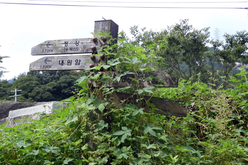 도솔봉, 순화궁계곡, 새광장 갈림길이다. 노랑 입간판 뒤로 순화궁계곡길인데 아무런 안내 표식이 없다.