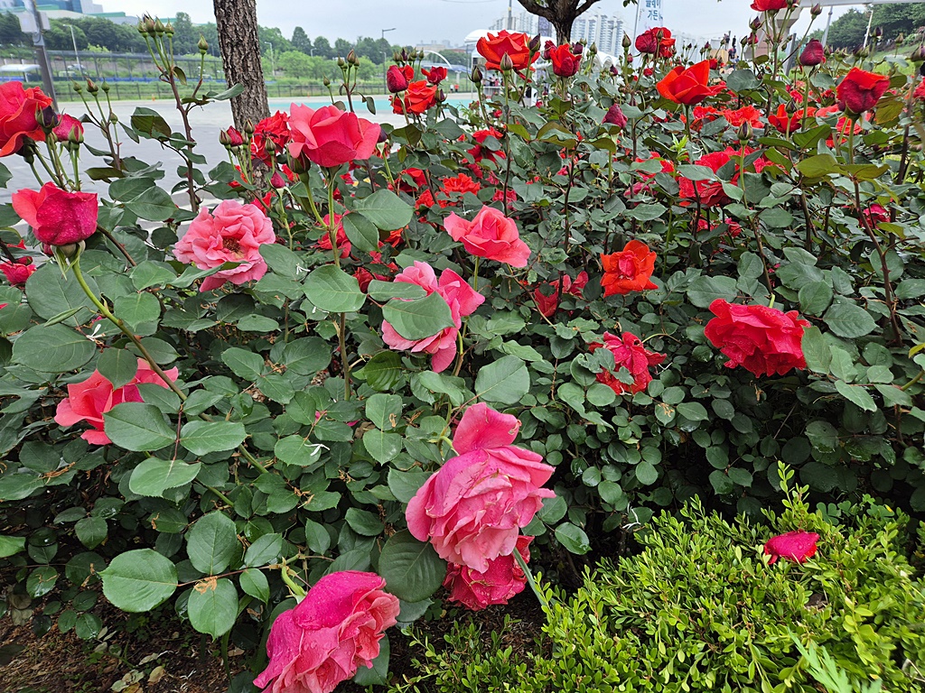 하천길에서 둑방길로 올라 오니 더 많은 여러 종의 장미가 피어 있다.
