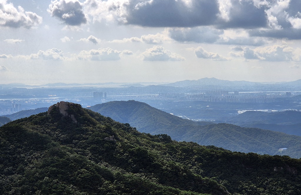 상장능선 뒤로 한강과 인천앞바다가 보인다.