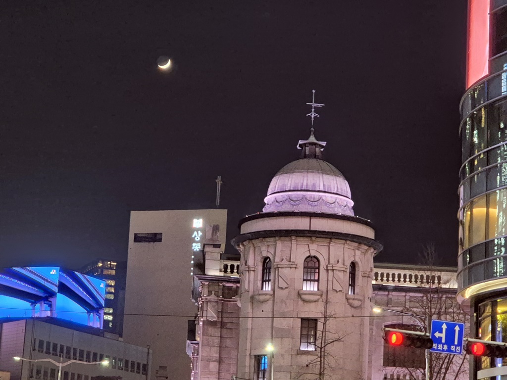 하늘을 쳐다보니 한국은행 첨탑 위로 초등달의 모습이 예쁘다.