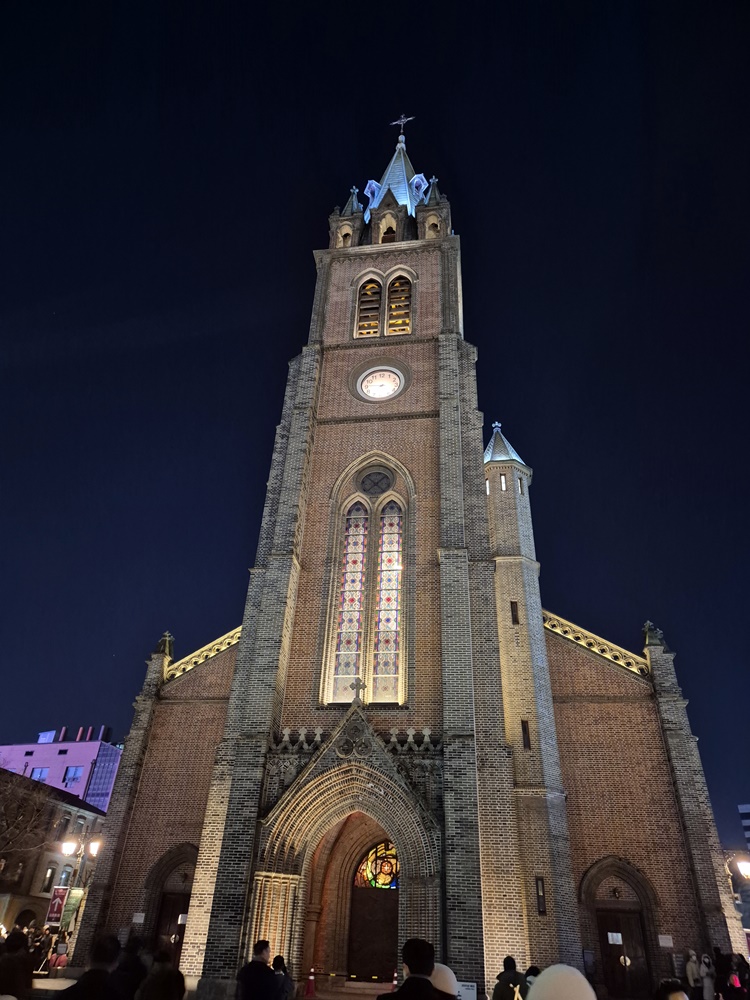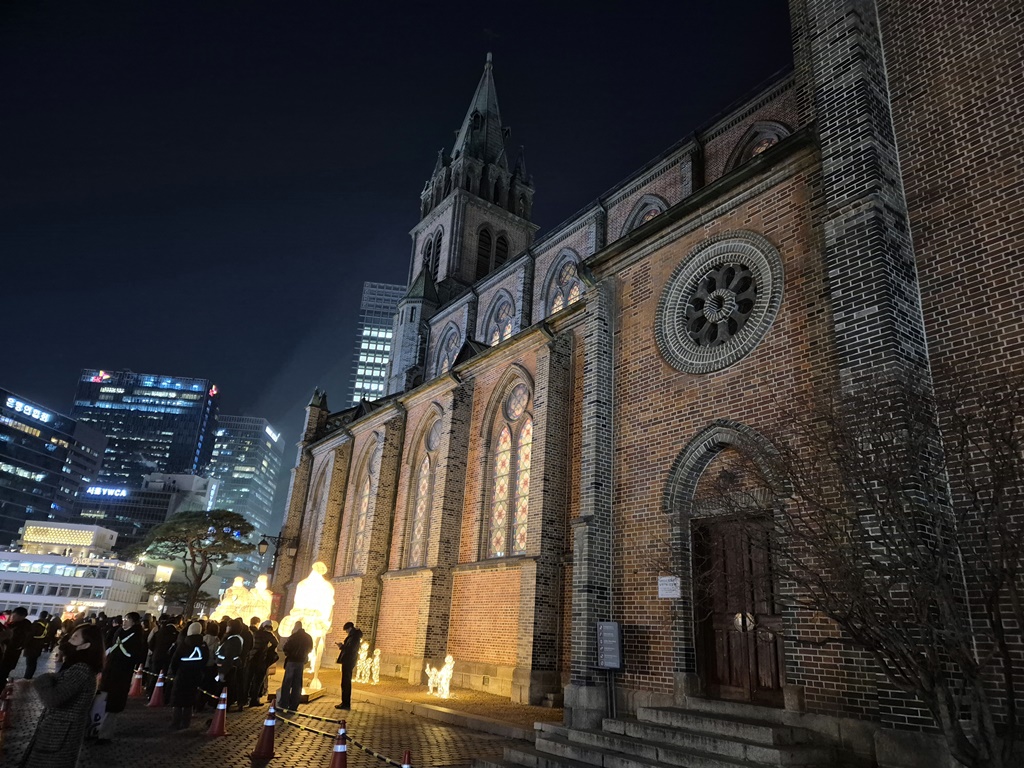 명동성당에 도착했는데 아름다운 조명이 어둠을 밝히고 있다.
