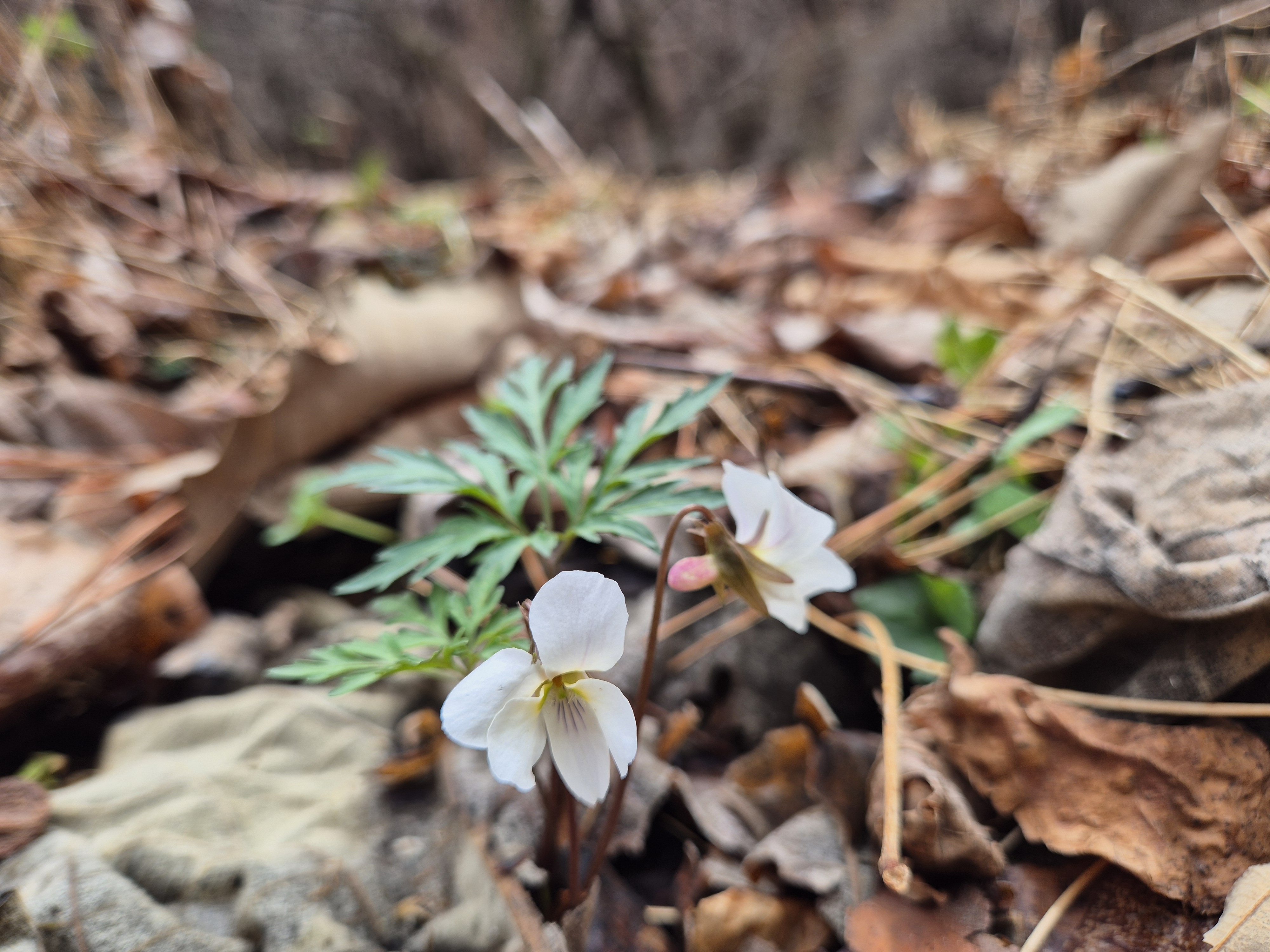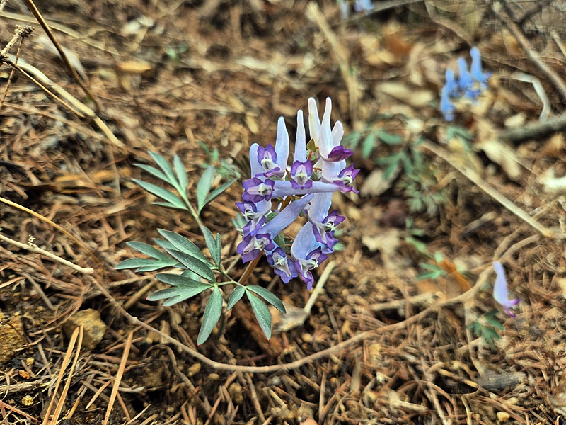 벌목지 뒤엎은 땅에 현호색의 종이 다양하게 피어있다.