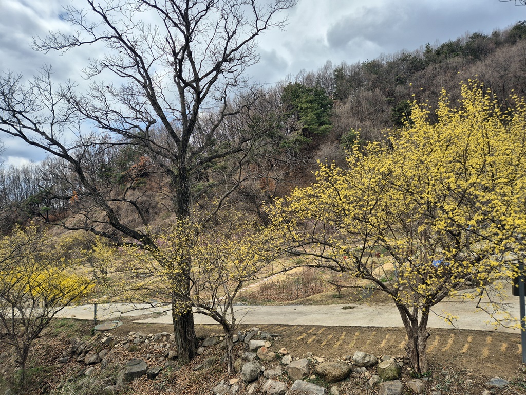 일요일 지척의 응봉산 개나리 보고 월요일 광덕산 모데미풀 보고.. 오늘은 산수유로 유명한 추읍산을 간다.