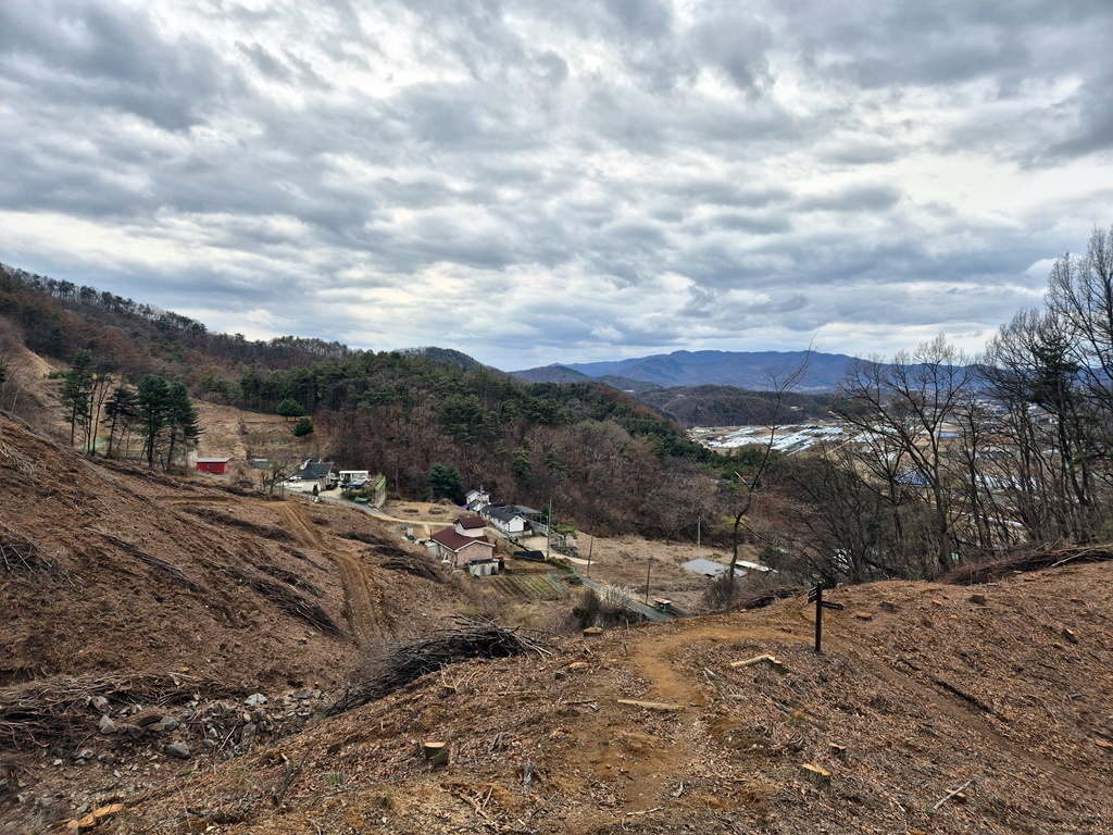 개활지의 모습이 보인다. 새로운 수종을 심으려고 하나? 산을 완전 벌거숭이를 만들었다. 우측으로 내려 선다.