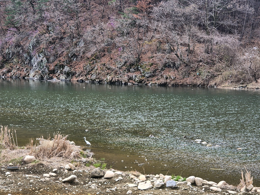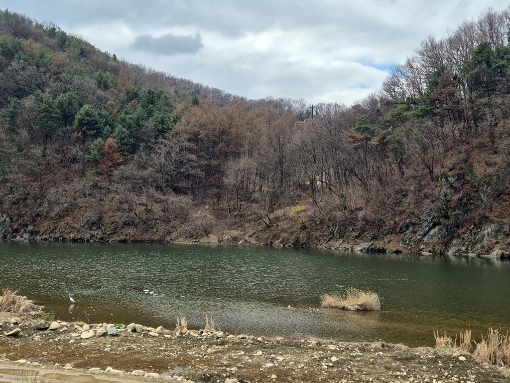힘들어 한 숨 돌릴때는 산수유마을을 바라봐주고.. 마을 뒤로 남한강이 보인다. 건너는 경기도 광주의 산들이 보이고..