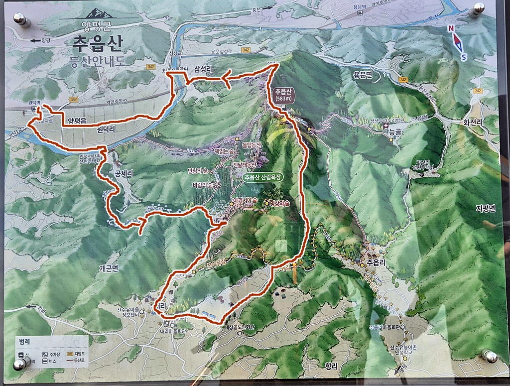 오늘 원덕역에서 부터 걸은 코스다. 2011년 추읍산을 왔을때는 가운데 코스를 이용했고..